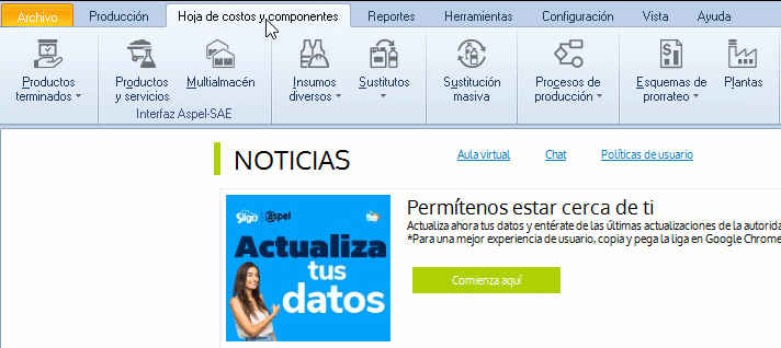 3. Ingresa desde la siguiente ruta: Menú Hoja de costos y componentes, despliegas el submenú de Proceso de producción y das clic en el ícono Procesos de producción