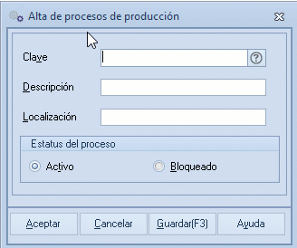 - Estatus del proceso: indica si el proceso estará disponible para la fabricación de productos (activo) o si estará bloqueado, lo que significa que no podrá usarse para la fabricación, pero permanecerá en el catálogo. Puedes cambiar esta opción cuando lo necesites.